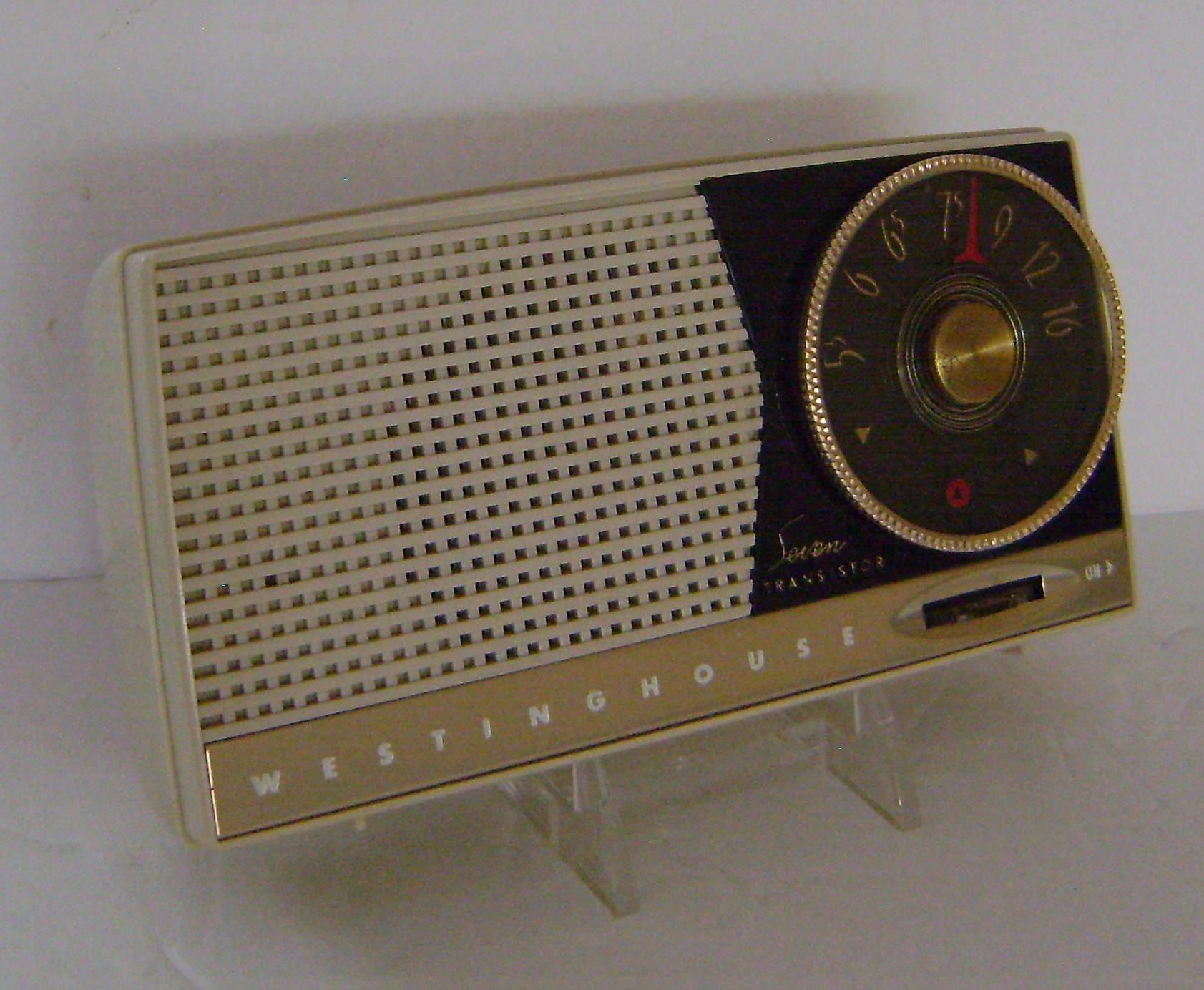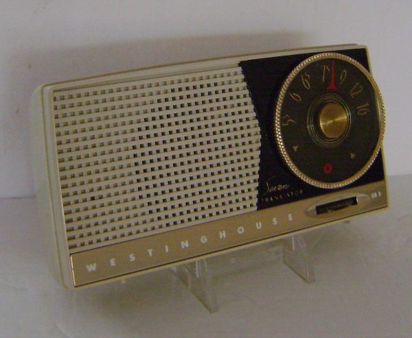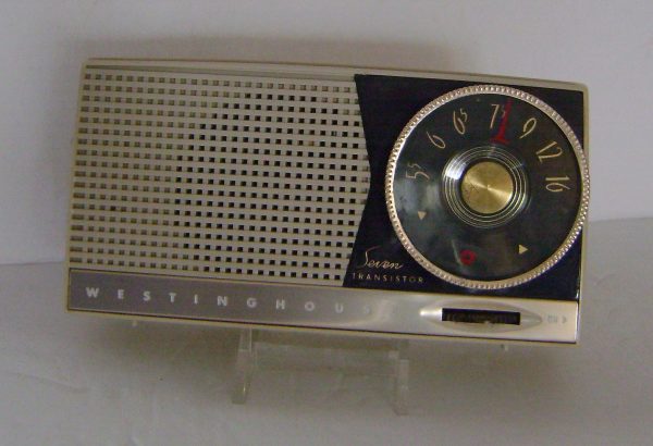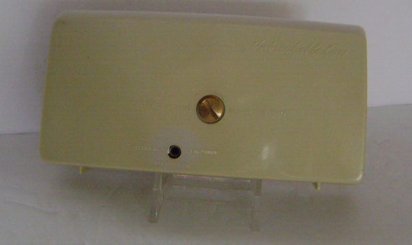 Offered here is this smart looking early seven transistor from Westinghouse. This radio features a large tuning dial and an “unbreakable” cabinet. This radio has survived in excellent cosmetic condition and is without chips or cracks. It is clean inside except for corrosion on a battery terminal, and it takes an obsolete battery, thus it is untested. Includes original leather case.