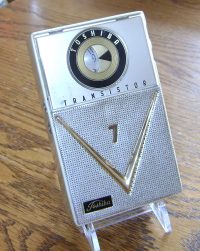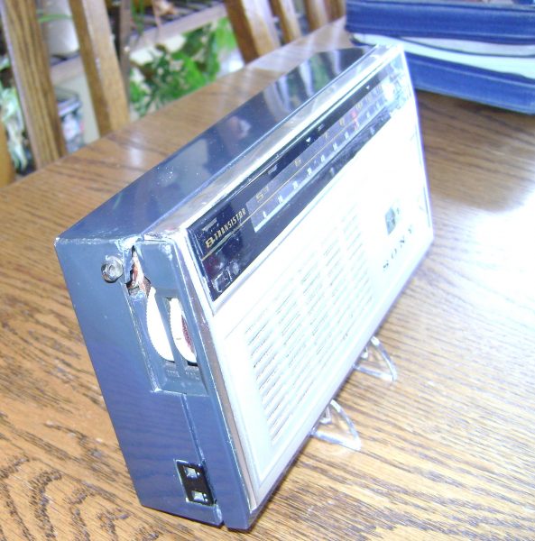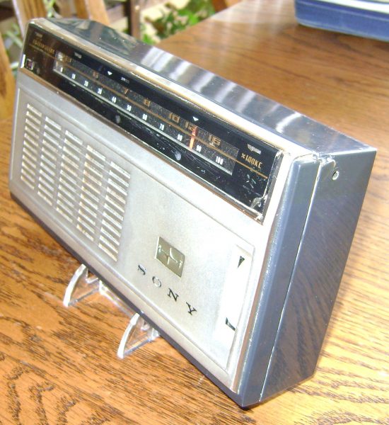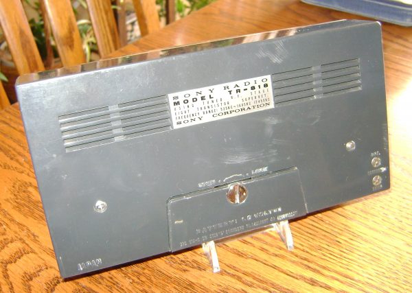 Here is an 8 transistor radio model TR-818 from Sony.  Measuring in at 7.5″ x 4″, this set is a handful.  It runs on 3 “C” batteries and plays fantastic.  It even has a tone control dial.  The radio does have a chip at each top corner as shown in the photos.