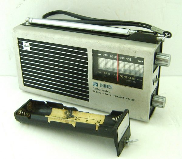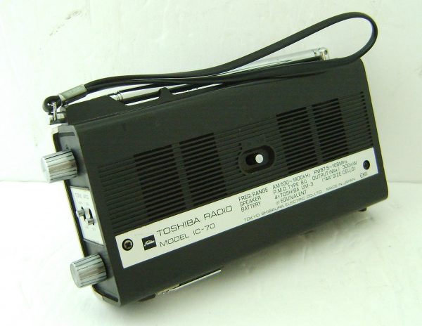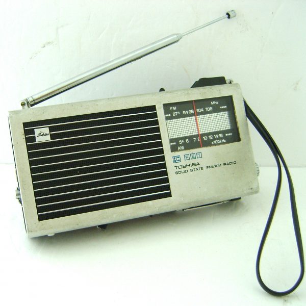 Offered here is this integrated circuit AM/FM radio from Toshiba. Made in the late 70’s this higher tech transistor is a great performer. It is compact at only 6 1/2″ wide. This operates as it should on 4 AA batteries. This cool radio features a fold-out stand, long and strong telescoping antenna, and a tone control switch.