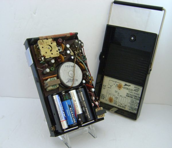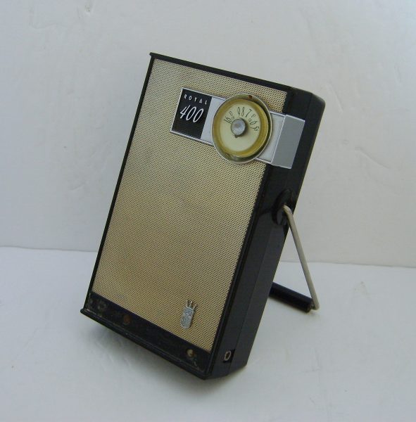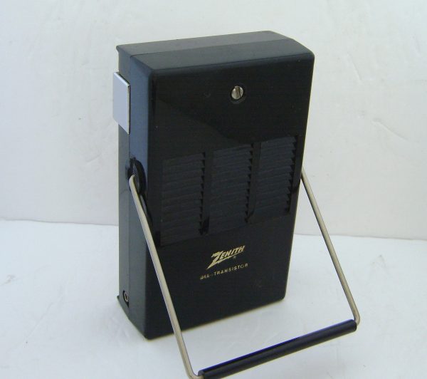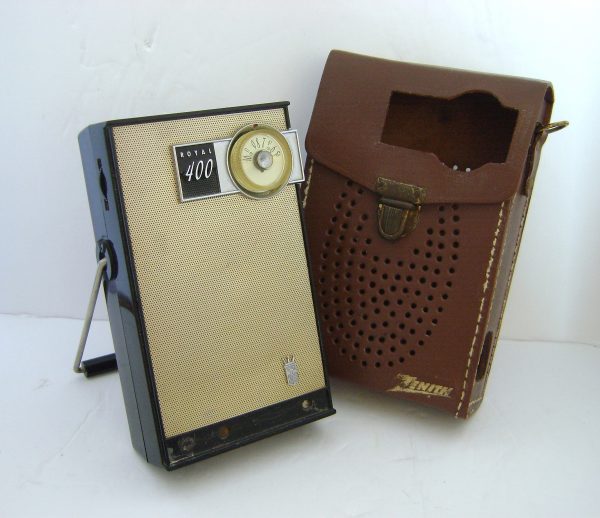 Nice looking example of this great model from Zenith.  The Royal 400 is an under-rated radio, and this example plays fine with no chips or cracks, but it is missing the name badge on the bottom.  Includes original leather carrying case.  Listen to it play here:  MOV01211