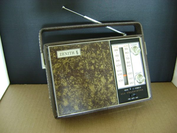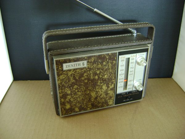 Offered here is a beautiful Zenith portable with AM and FM reception.  This sharp and uncommon radio is in beautiful clean condition with the synthetic “leather” cover in excellent condition.  A solid performer on both bands, this is in very clean condition.  Works on a four common AA batteries.